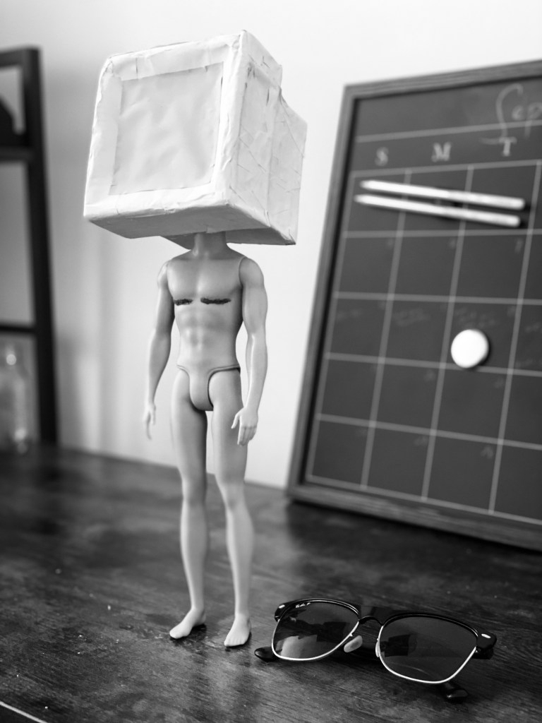 Hence, my avatar: a Ken doll with visible subcutaneous mastectomy scars and a computer monitor for a head. His naked body (the subcutaneous scars and his lack of a penis) represents my interest in LGBTQ+ studies, as well as my own queer identity. The bulky late ‘90s/early 2000s monitor represents my interest in online communities and my Millennial childhood.